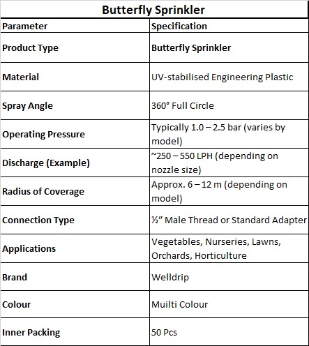 Manufactured by Welldrip Irrigation Industries — a trusted name in drip and sprinkler irrigation systems in India — this Butterfly sprinkler is built from UV-stabilised engineering plastic for corrosion and weather resistance. It works reliably at low to medium irrigation pressures, making it suitable for vegetable farms, orchards, horticulture, lawns, nurseries and landscaping applications.