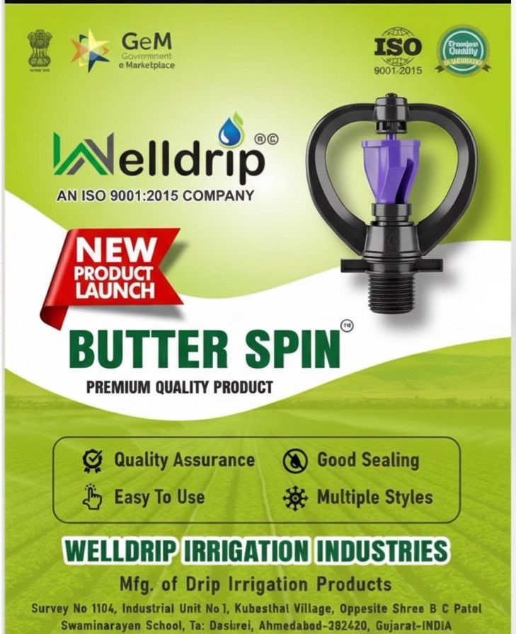 Welldrip Irrigation Industries is a trusted name in agricultural irrigation systems, specializing in butterfly sprinklers that provide uniform and efficient water distribution for crops, lawns, and gardens. Our sprinklers are manufactured using UV-stabilized engineering plastic and precision nozzles to deliver consistent spray coverage even under low pressure.